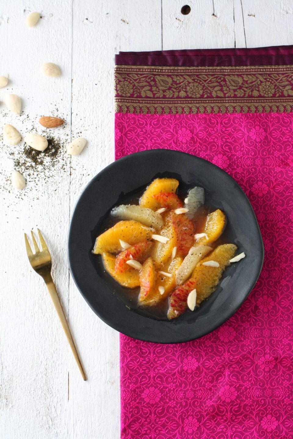 Agrumes de saison infusés au Tchai, amandes fraîches
