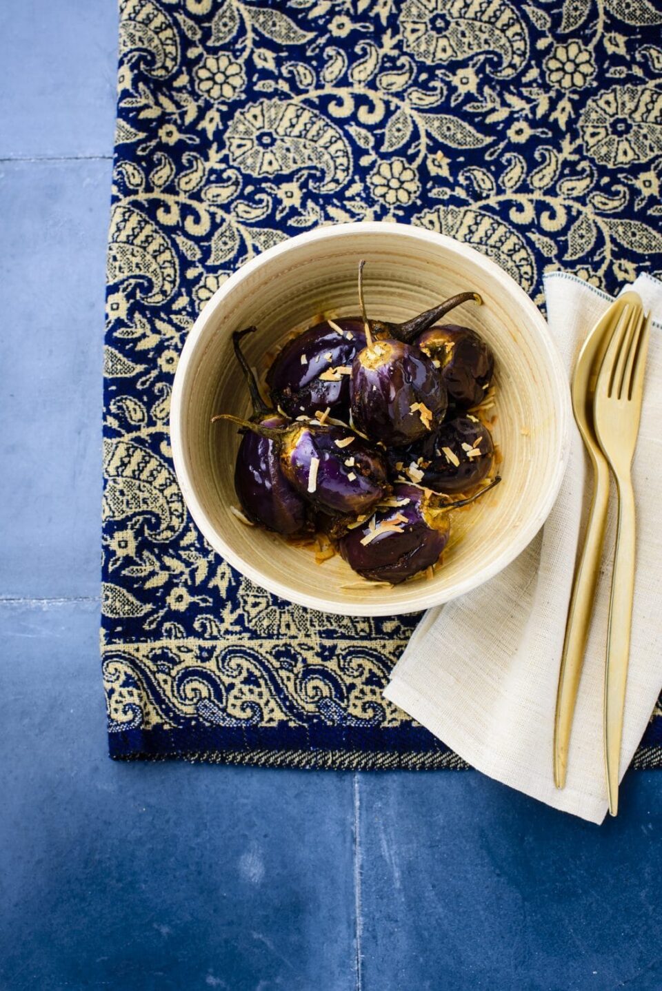 Servez les aubergines confites aux épices et à la noix de coco avec un pain chapathi ♡