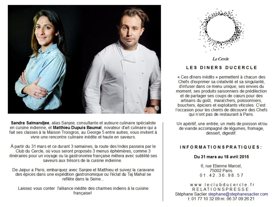 À partir du 31 mars et ce durant 3 semaines, la route des Indes passera par le Club du Cercle, où vous seront proposés 3 menus éphémères, comme 3 itinéraires pour un voyage ou la gastronomie française mêlera avec subtilité ses saveurs aux trésors de la cuisine indienne.