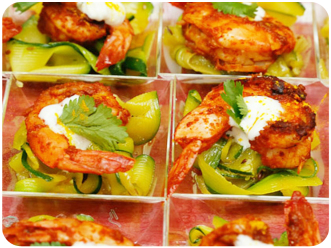 Crevettes tandoori, tagliatelles de courgettes au curcuma & crème fouettée au gingembre