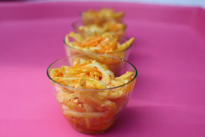 Mélanger les carottes, le choux & le piment et verser la sauce citronnée dessus.