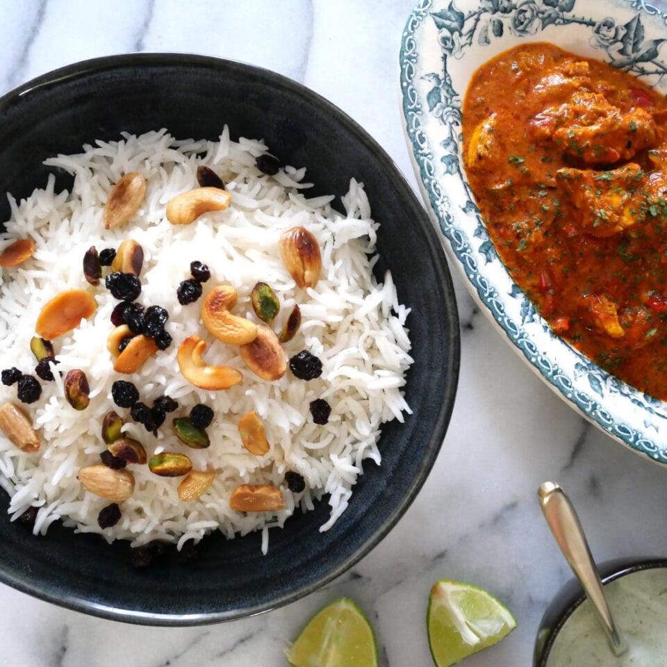 Un poulet Tikka massala crémeux et relevé à la fois grâce à une sauce tomate dense, de la coriandre fraîche, servi avec un riz basmati parfaitement cuit garni de fruits secs, un chutney à la menthe et des naans.